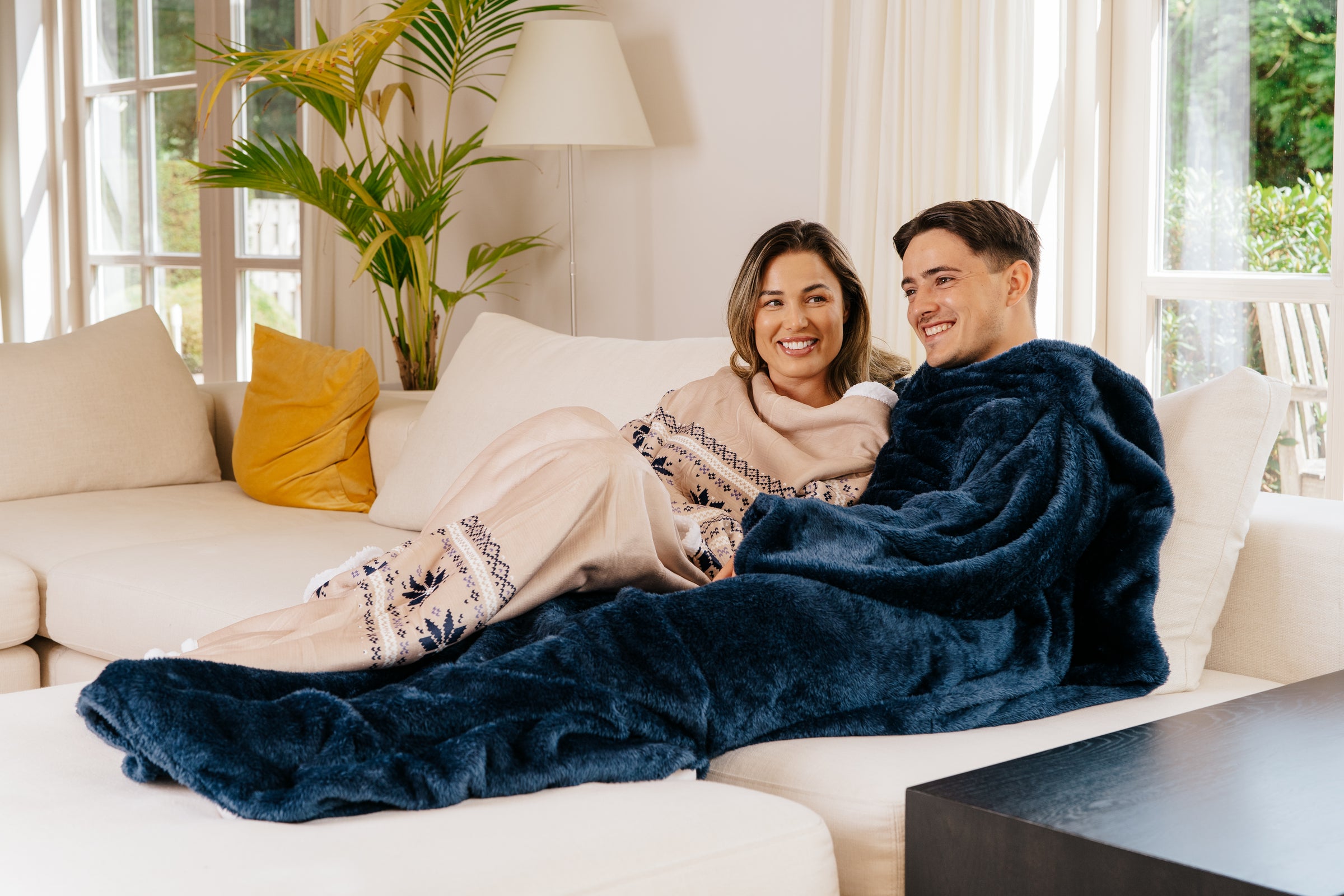 Een 'Noony Deken' is een deken met mouwen. Je kunt je zelf er heerlijk mee inpakken zonder dat je beperkt wordt in je bewegingen. De achterkant is in tegenstelling tot de Noony Hoodie open. De binnenkant bestaat uit heerlijk warme sherpa en de buitenkant bestaat uit fluweel zachte fleece.